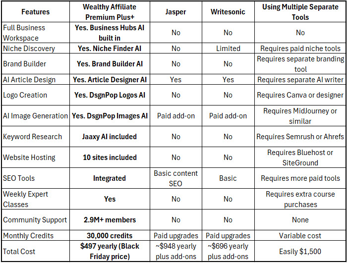 Wealthy Affiliate AI vs Jasper vs Writesonic vs “Multiple Tools Approach